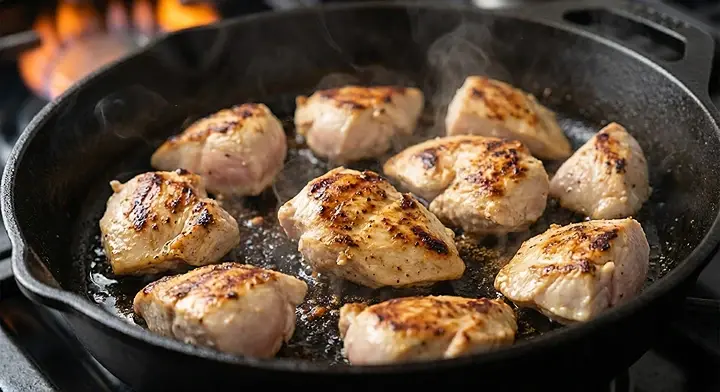 🚫 주의: 불을 센 불로 오래 두면 닭가슴살이 퍽퍽해집니다. 중불 4분으로 겉면만 먼저 익히세요.